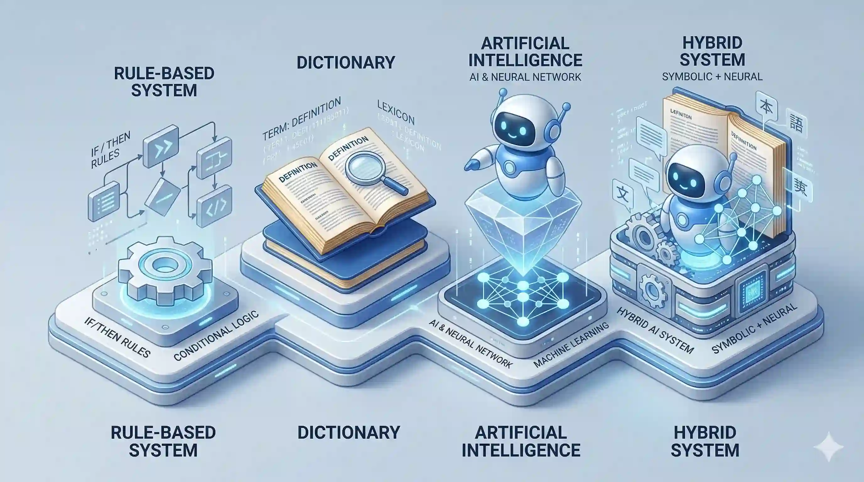 主な種類は、ルールベース型、辞書型、ハイブリッド型、AI型の4つです。